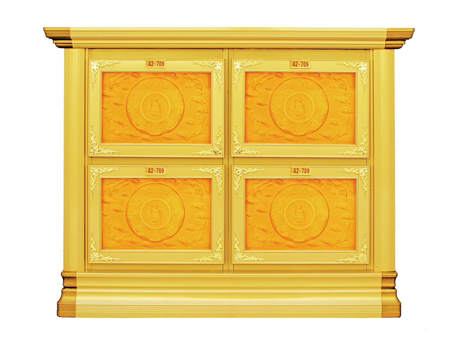 骨灰存放架是由箱體、面板、側板、頂蓋、底座、轉角、封板等構成,以及佛臺、掛落、佛 龕等相關配件構成。 箱體:分鍍鋅板、不銹鋼板、鋁板等五金板材箱體,鋁合金中空板扣接式箱體和純鋁壓鑄型 箱體。 面板:面板根據工藝不同、材料不同,風格各異、大不相同,既要起到美觀易分類作用,又 要起到防火、防塵、防潮、防蟲等作用。 側板:用于裝飾和保護箱體側面的作用,又可根據現場,對存放架分類的標識作用,一目了 然方便管理。 頂蓋、底座:都是穩固整列和整排箱體水平線,底座還起到一部分承重作用。 轉角、封板:箱體轉彎處和空隙處塑形的作用。 佛臺:由幾個骨灰存放架組成一個小型佛龕臺,用于放置佛像。 佛龕、掛落:整排存放架為了劃分區域,在每個區域靠墻上方,設置小型佛龕,為了美觀, 加上掛落。